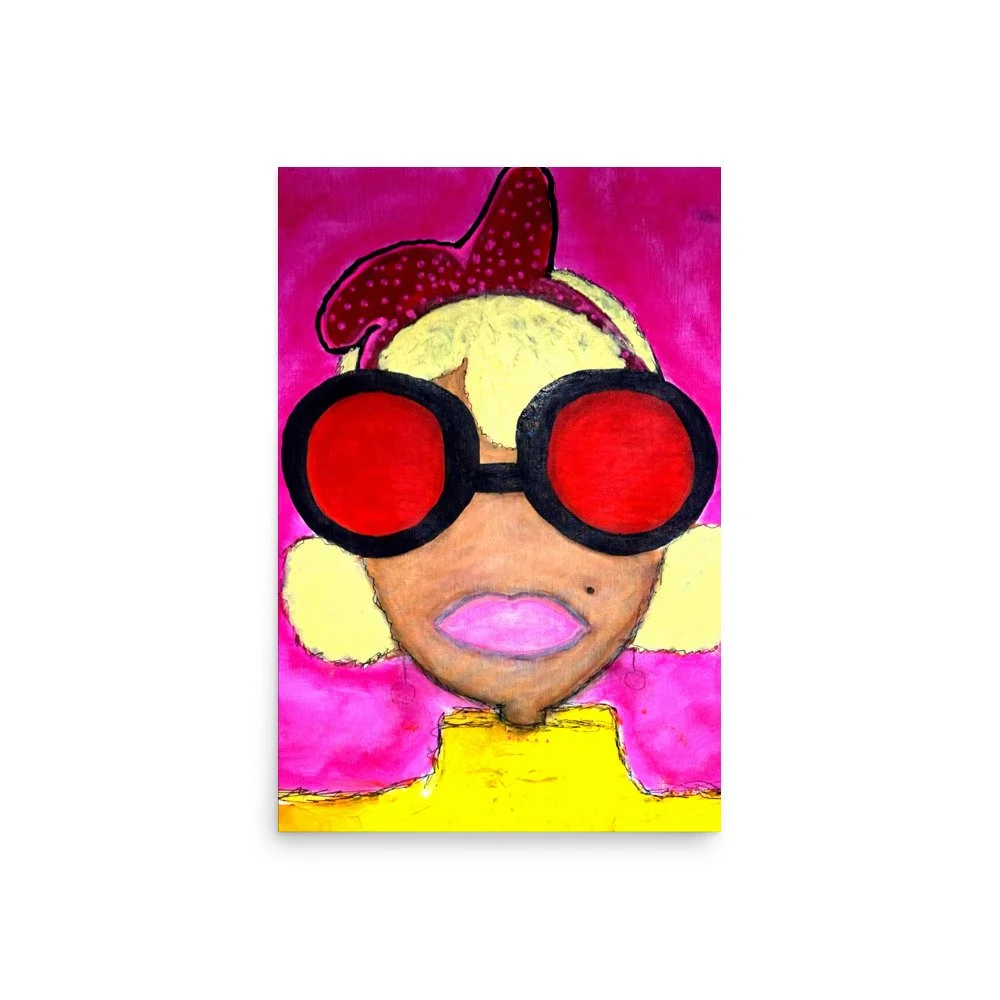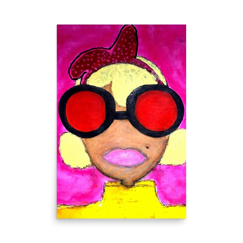 Retro Glam portrays a vibrant figure with yellow hair and a matching top, set against a bold pink background. Oversized black-and-red sunglasses bring a playful attitude to this striking tribute to confidence and vintage flair.