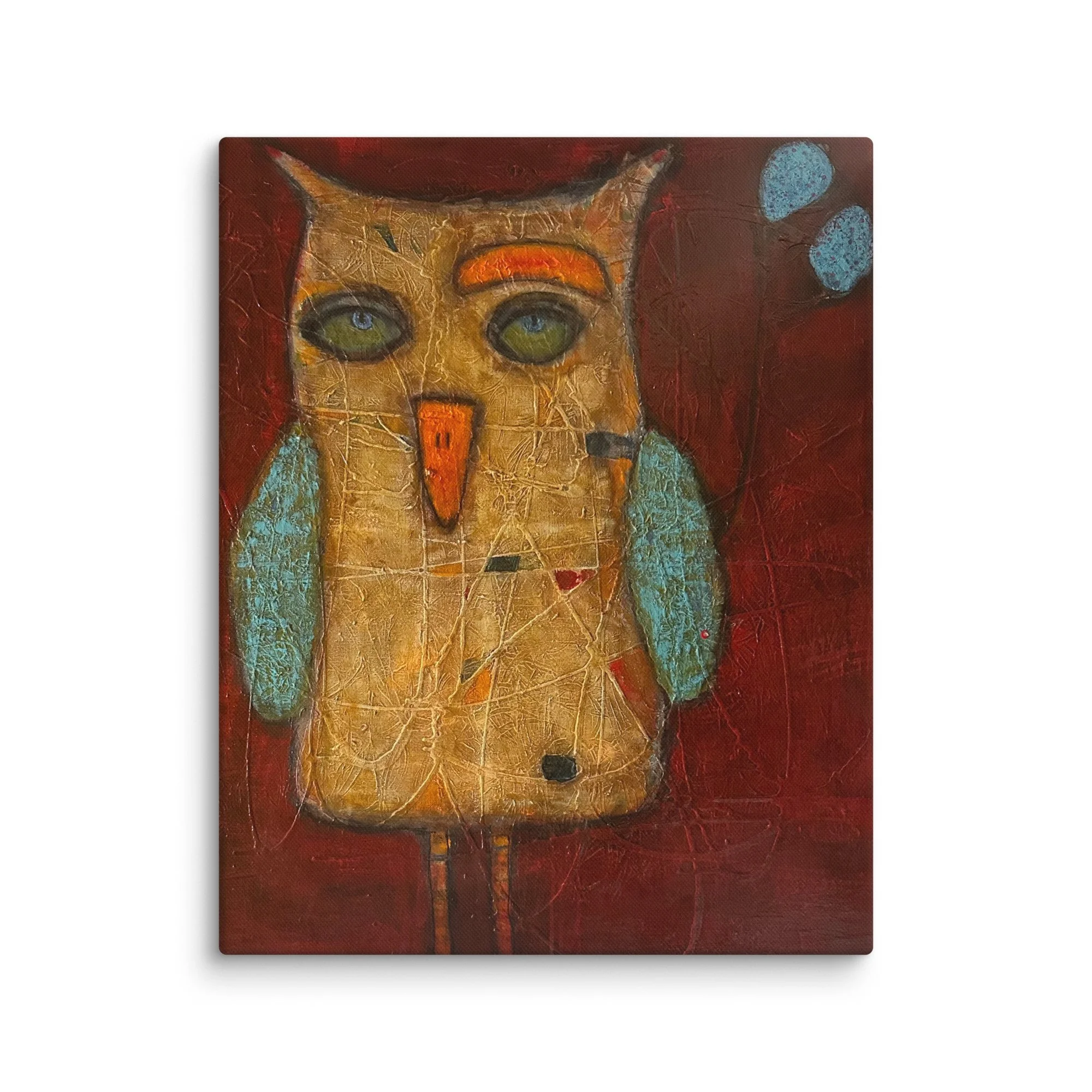 Wisdom is an owl-like guardian, gazes from the canvas, layered in warm reds and glowing with insight. Its presence is ancient, its silence knowing a protector of stories untold.